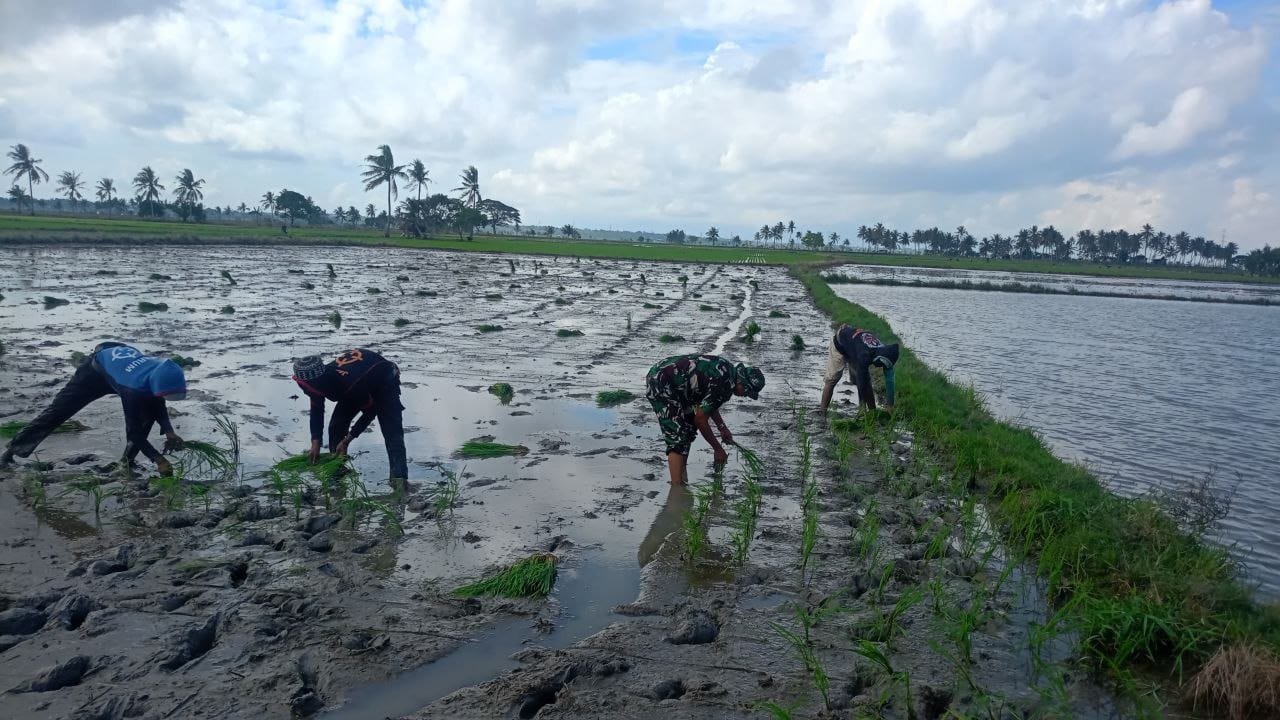 Di bawah terik matahari, Serka Ramli tidak sekadar berdiri memantau, tetapi ikut berjibaku di lumpur sawah, membaur bersama para petani. Kegiatan ini menjadi bukti nyata dukungan TNI terhadap program ketahanan pangan nasional serta percepatan masa tanam di daerah.