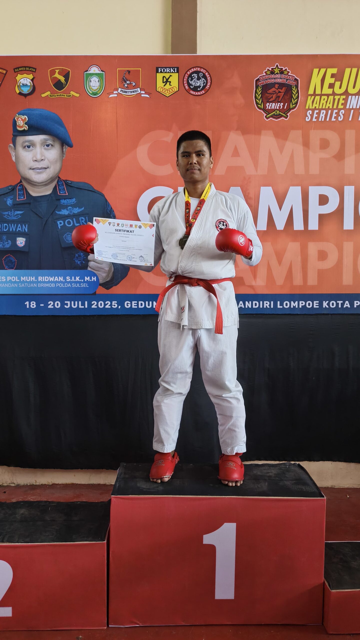 INTEL -NEWS MY ID , -Sidrap – Bripda La Majeng Anggota Sat. Samapta Polres Sidrap berhasil meraih juara 1 pada kejuaraan Karate Inkanas Sulsel Series I Tahun 2025 pada kategori festival + 70 kg komite Polri yang digelar di GOR Mandiri Lompoe Kota Parepare, Minggu (20/7/25) pagi