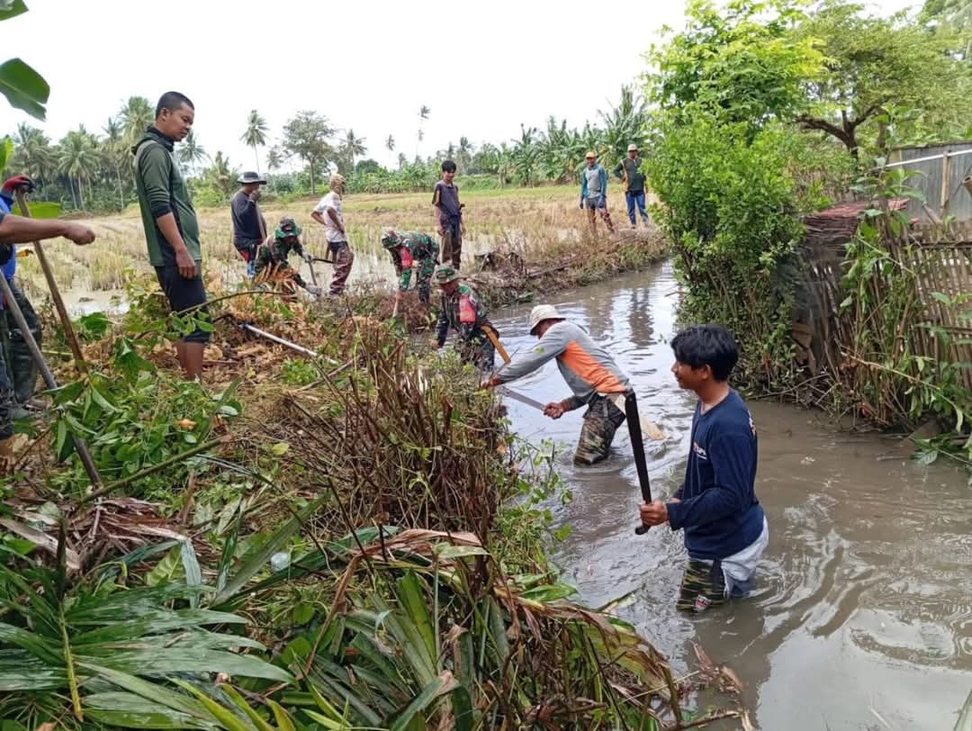 Dukung Swasembada pangan, Koramil 1420-07/Baranti Bersihkan Saluran irigasi Bersama petani.