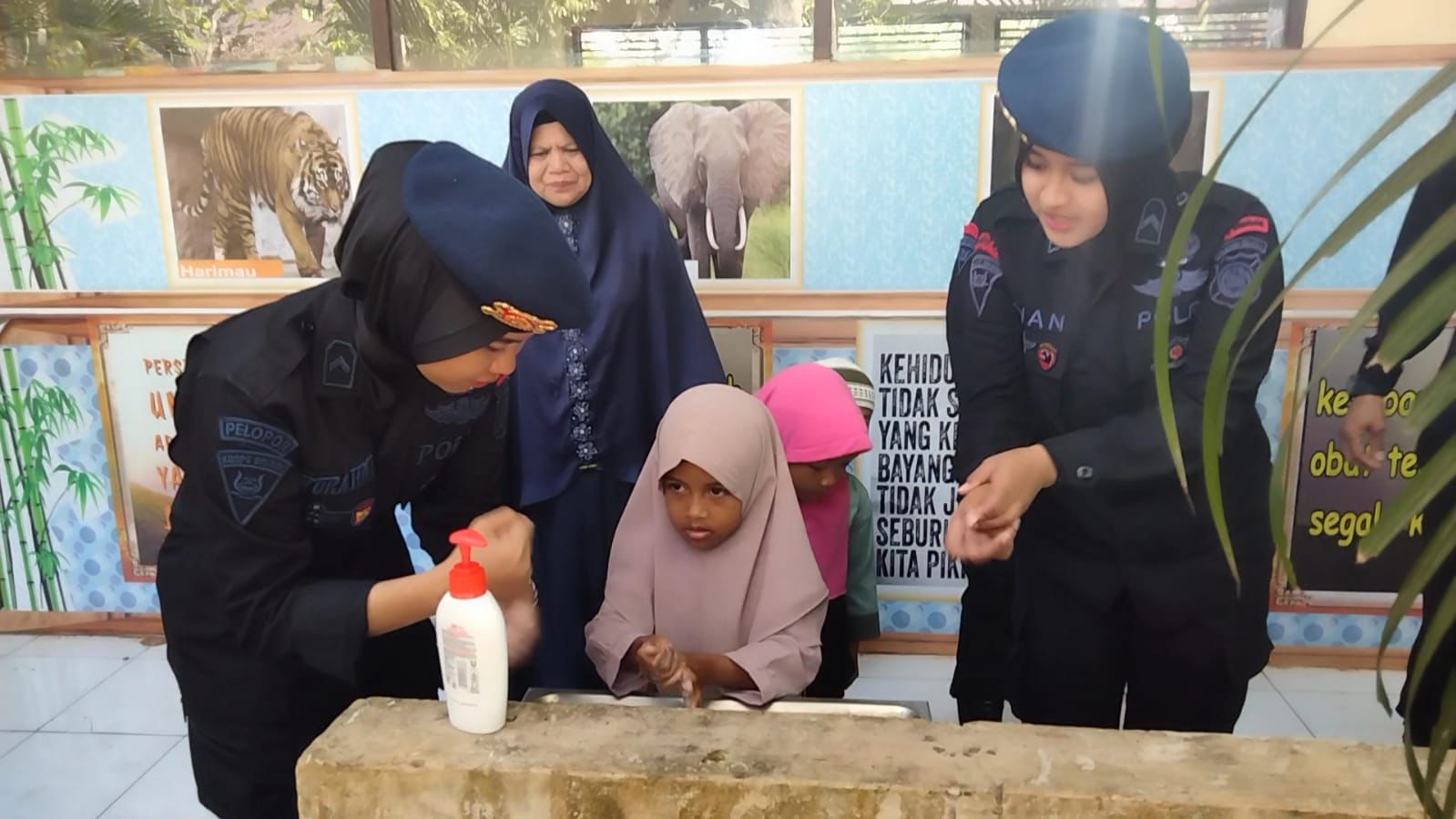 Sebelum makanan dibagikan, para murid diajari cara mencuci tangan yang bersih dan benar oleh Polwan Brimob. Setelah itu, mereka diminta kembali duduk di kursi masing-masing untuk menerima makanan. Tidak hanya membagikan makanan, para selebgram juga menghibur murid-murid dengan berbagai permainan menarik.