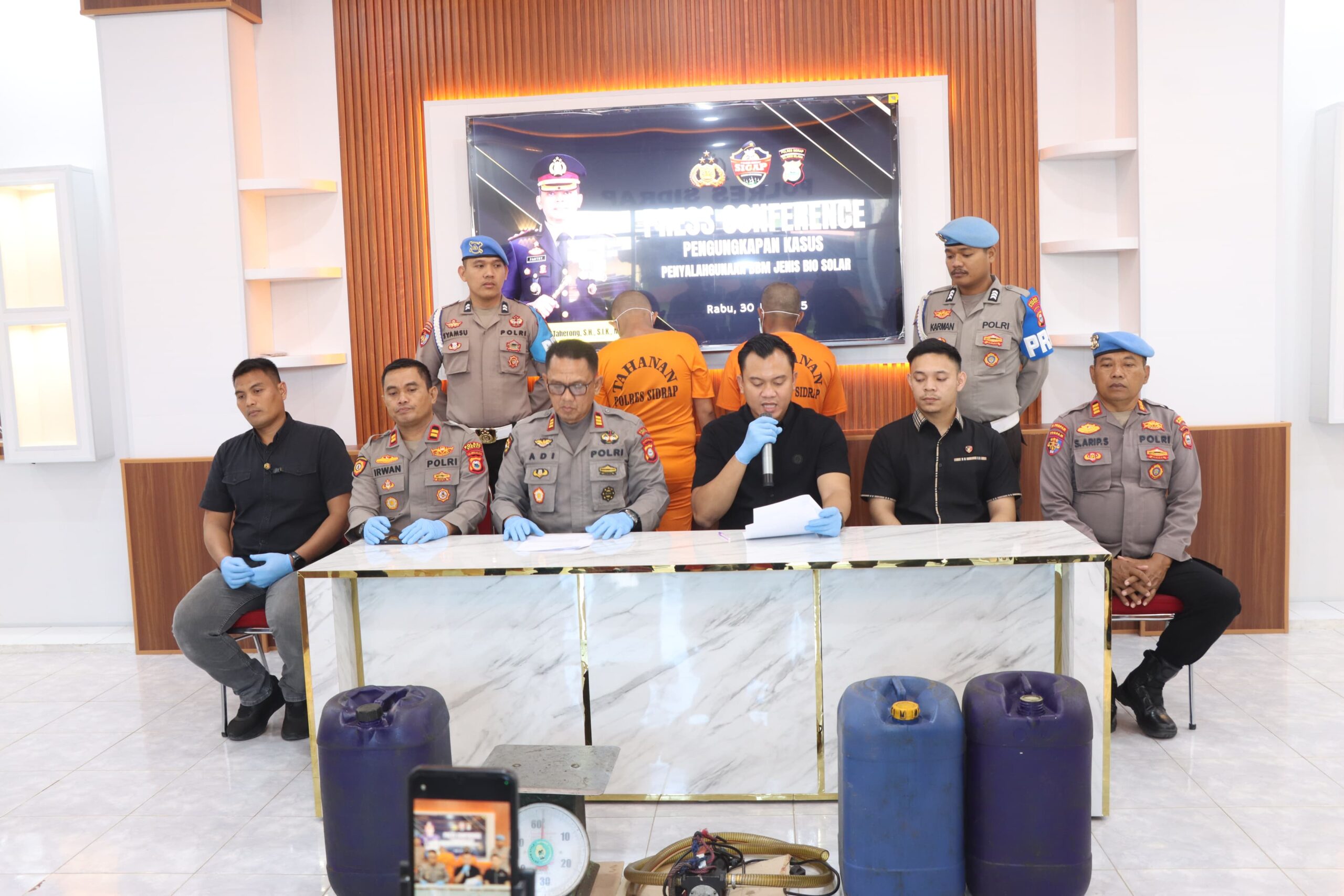 “Pada kesempatan ini, kami menyampaikan hasil penindakan yang dilakukan oleh tim penyidik Tipidter Sat Reskrim Polres Sidrap, bahwa kami mengamankan 2 orang tersangka di Desa Damai Kecamatan Watang Sidenreng Kabupaten Sidrap yang diduga terlibat dalam penyalahgunaan BBM bersubsidi.” ujar Kasat Reskrim