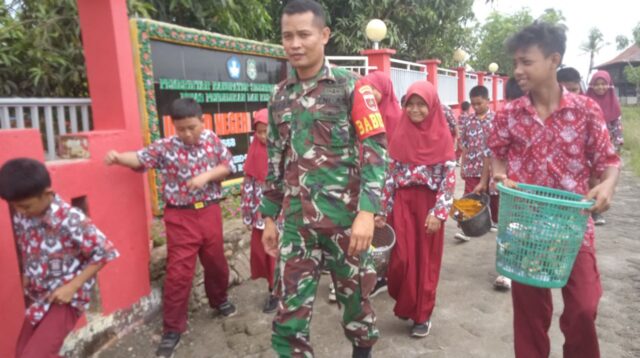 Peduli Kebersihan di lingkungan Pendidikan, Babinsa Ciro Ciroe ajak Siswa bersihkan Halaman Sekolah.